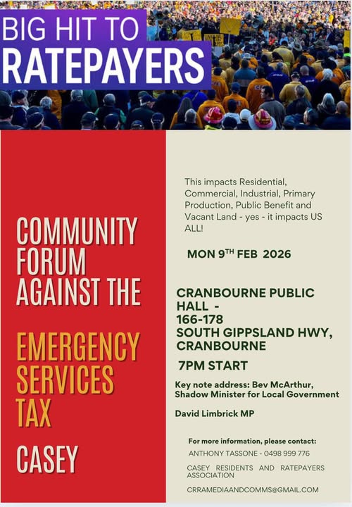 Community Rally – Cranbourne Public Hall – 9th February 2026. Come and help support our resolve to abolish the wrongful emergency services levy.