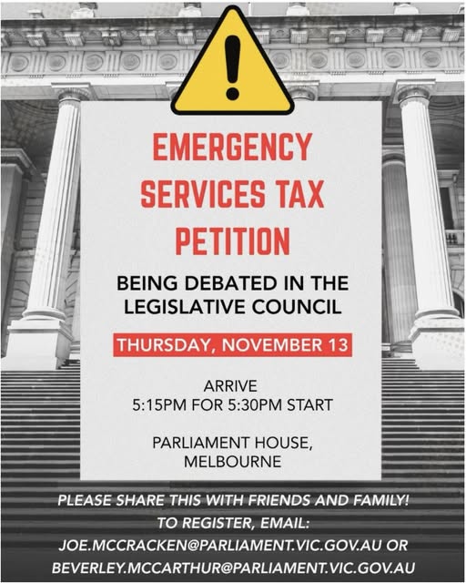 The Emergency Services Scrap the Tax Petition is scheduled to be debated in the Legislative Assembly on the 13th of November – Arrive 5:15 for a 5:30 start – Parliament Victoria. #scrapthetax