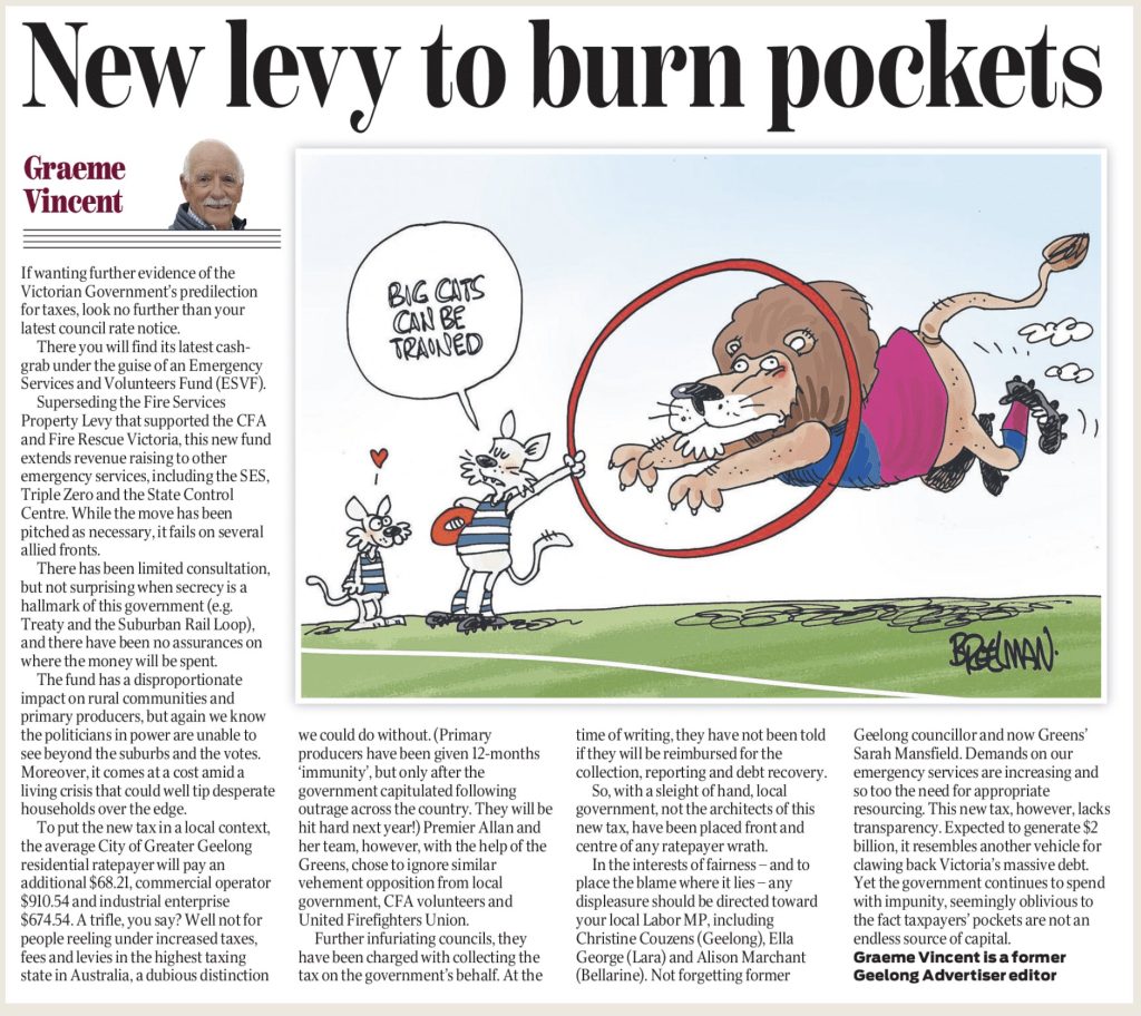 In the Minister for Emergency Services’ own electorate of Eltham, Council has raised serious concerns about the Emergency Services and Volunteers Fund levy. This tax is unrelated to local needs and unfairly impacts families, small businesses, and primary producers