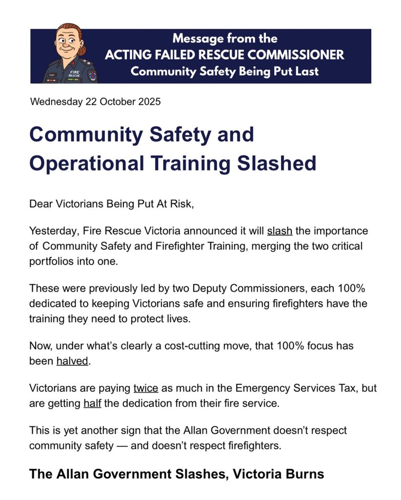 Jacinta Allan’s ‘Emergency Services’ Tax is nothing more than a cash grab that is being used to plug budget black holes, whilst CUTTING funds to our emergency services. Across Victoria, our Voices grow louder everyday!