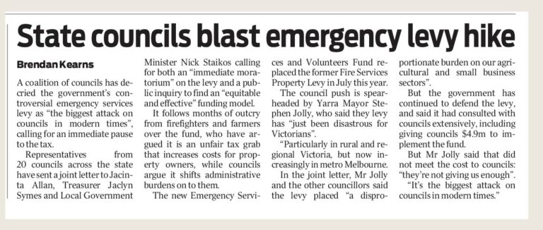 Councils from Across Victoria and across the Political Spectrum have written to the Victorian Government requesting a meeting regarding the impact of the Emergency Services Tax on their local communities.