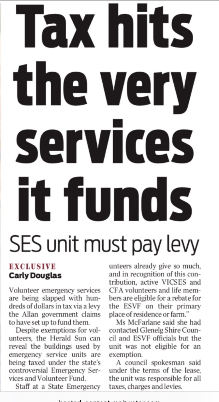 Victorian volunteer emergency services are being taxed under the Allan government’s controversial emergency services levy in what’s been called a “slap in the face” to those serving the community.