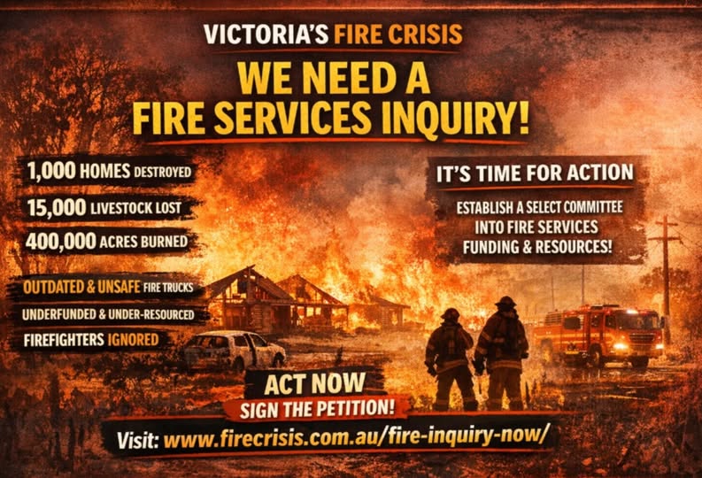 A coalition of career and volunteer firefighters are calling for an urgent Parliamentary Inquiry into the January 2026 Victorian fires, warning that the scale of devastation now unfolding was foreseeable and preventable after years of government underinvestment in fire services, ageing fire trucks and ignored warnings from firefighters.